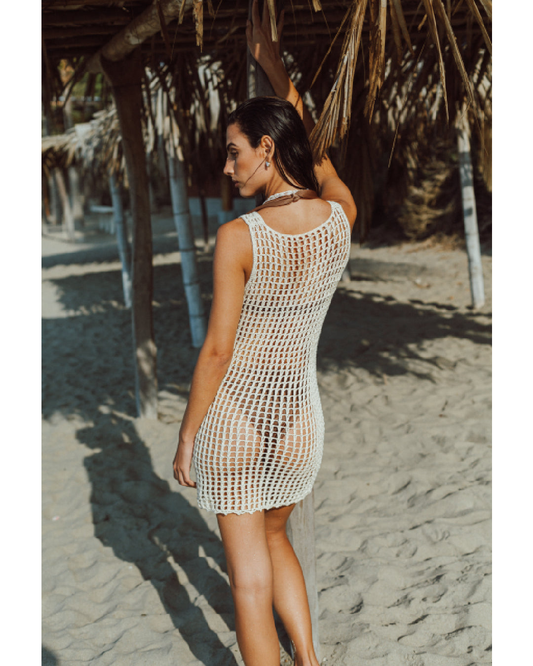 Nuestro cover-up Thais es tejida a crochet con fibras de algodón y con un fino hilo dorado que le da un ligero brillo a la prenda, tiene escote en V.