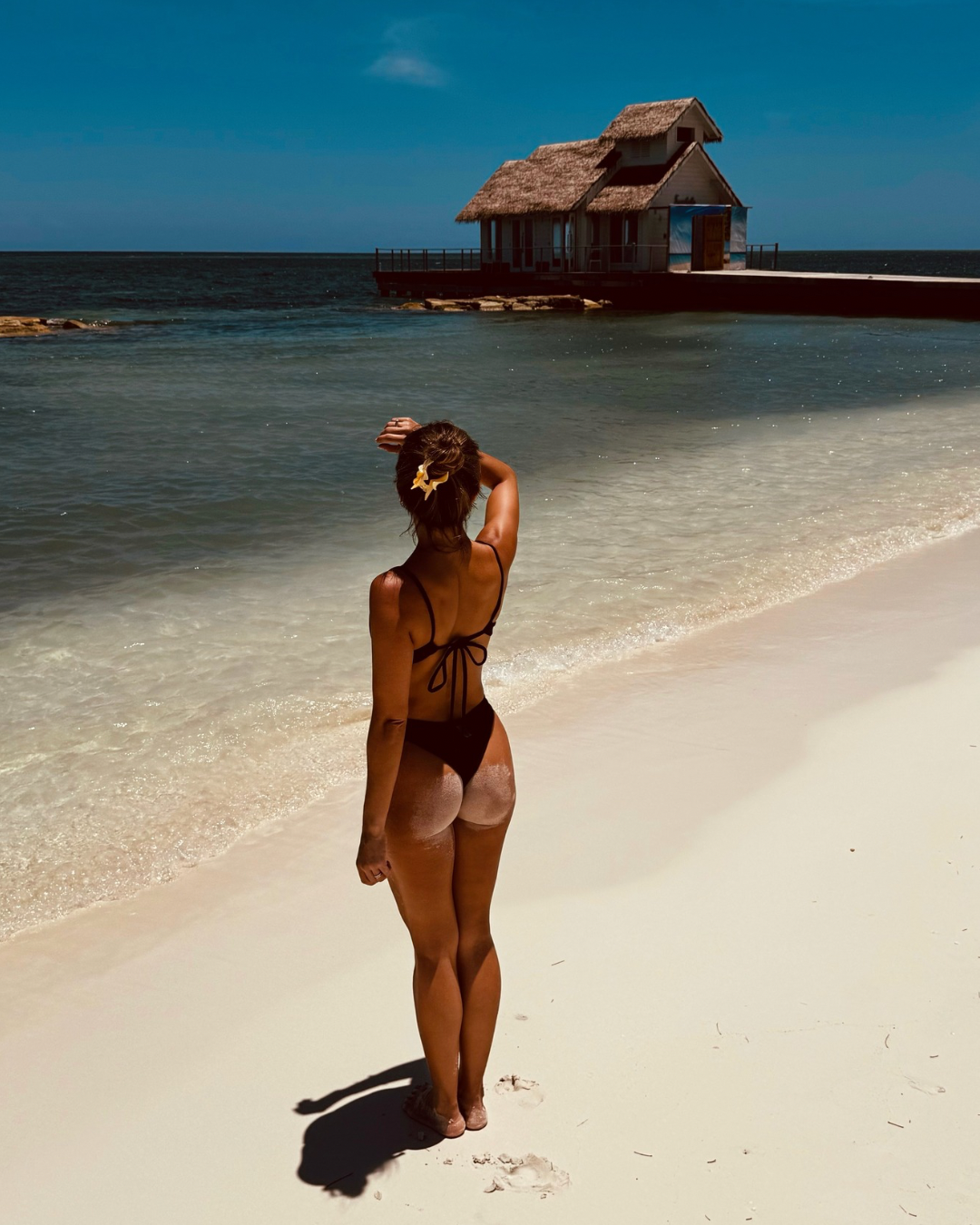 2. Para retirar el exceso de agua de tu bikini/ropa de baño deberás colocarlo en tus manos y apretar las palmas una contra la otra. No retuerzas la prenda podría perder su elasticidad y resistencia.