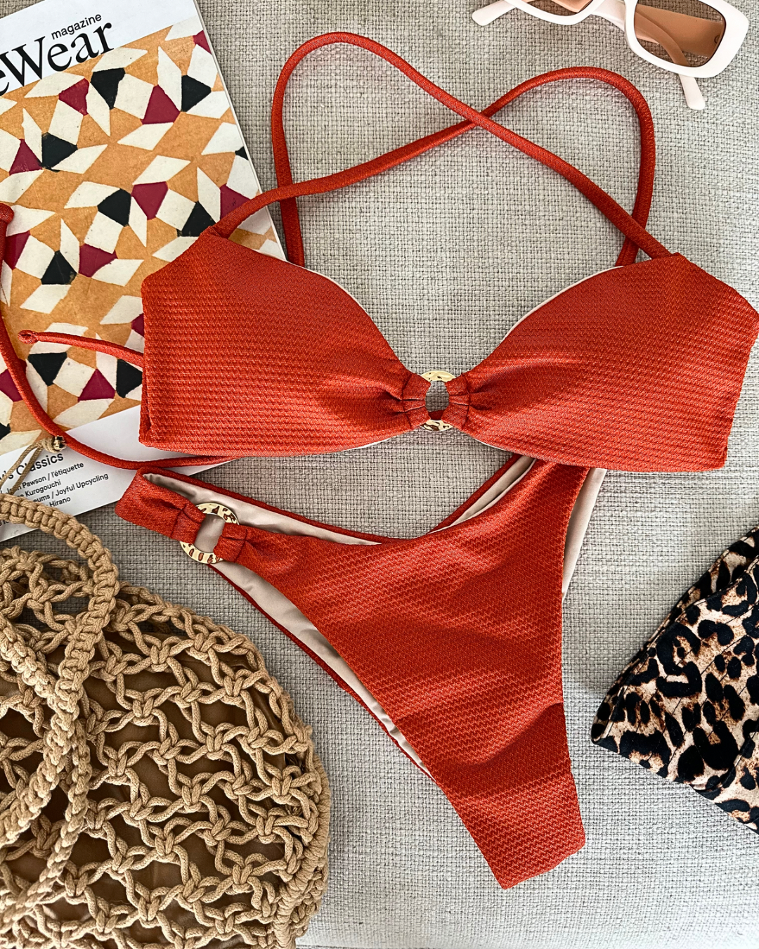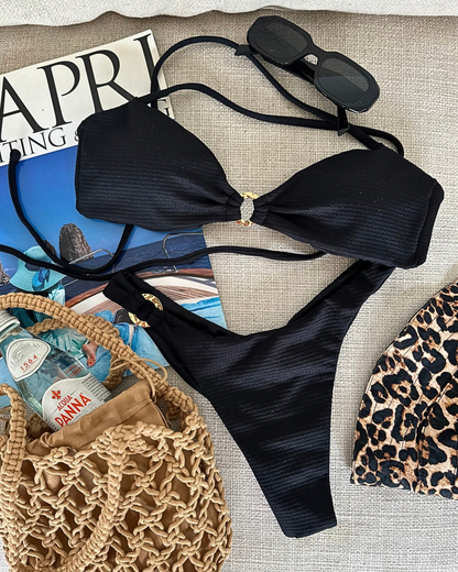 El bikini Fiji tiene en el top almohadillas removibles y tiras regulables en la espalda. El bottom es a la cintura, tiene corte de pierna alta que estilizará tu figura y un aro dorado de calidad como detalle que le da un realce a la prenda.