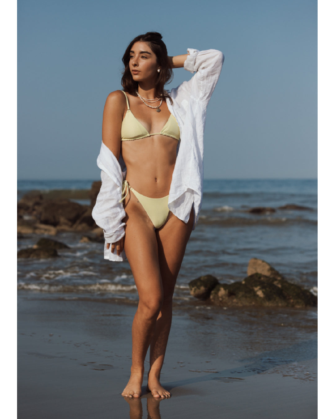 El bikini Praia es de triángulos y de lycra con ligera textura, con tiras al hombro regulables y pitas en la espalda que puedes amarrar y ajustar a tu gusto al igual que el bottom. El top cuenta con almohadillas removibles.
